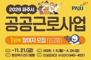 미디어라이프 중부신문 이종인 기자 | 파주시는 오는 21일까지 2026년 1단계 공공근로사업 참여자 152명을 모집한다고 밝혔다. 공공근로사업은 청년, 여성, 중장년 등 취업 취약계층에게 한시적인 일자리를 제공하고, 장기 실직자에게 재취업 도전의 발판을 마련하는 데에 목적이 있다. 근무 분야는 ▲공공서비스 ▲전산화 ▲환경 정비 등 3개 분야, 147개 사업으로 구성돼 있다. 참여 자격은 ▲사업 개시일 기준 18세 이상 ▲가구소득이 기준중위소득 70% 이하 ▲재산 4억 원 이하인 파주시민이며, 파주시 등록 외국인도 신청할 수 있다. 참여 희망자는 모집 기간 내 거주지 행정복지센터를 방문해 신청서와 구비서류를 제출해야 하며, 선발 여부는 12월 말 개별 통보될 예정이다. 선발된 인원들은 내년 1월 5일부터 4월 24일까지 근무하게 되며, 주요 근무조건으로는 ▲시간당 임금 1만 2,070원 지급 ▲4대 보험 가입 ▲주휴수당 및 연차 유급휴일 제공 등이 있다. 이이구 민생경제과장은 “내년도 공공근로 일자리는 최근 어려워진 경제 상황을 고려해 최대한 많은 인원을 선발함으로써 민생