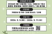 미디어라이프 중부신문 이종인 기자 | 가평청소년문화의집은 청소년 문화체험 프로그램인 ‘문플(문화+PLAY)’ 3차 참가자를 3일부터 선착순으로 모집한다고 밝혔다. ‘문플(문화+PLAY)’은 ‘삶에 문화를 더하고 즐기는 청소년’이라는 주제로 청소년들에게 다양하고 폭넓은 문화 활동을 제공하는 프로그램이다. 이번 3차 프로그램은 ‘트렌드 문화체험: 두쫀쿠 만들기’로 진행된다. 운영은 3월 14일 오후 2시, 18일 오후 6시 총 2회에 걸쳐 진행된다. 모집 대상은 가평 관내 만 11세(초등학교 5학년)부터 만 24세까지 청소년이며, 회차별 20명씩 총 40명으로 3일부터 12일까지 선착순 모집한다. 참가신청은 가평청소년문화의집 홈페이지에서 하면 된다.