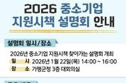미디어라이프 중부신문 이종인 기자 | 가평군이 관내 중소기업의 경영 안정과 경쟁력 강화를 위해 새해 정부의 지원시책을 한자리에 모아 안내하는 설명회를 연다. 가평군은 관내 중소기업을 대상으로 ‘2026년 중소기업 지원시책 설명회’를 오는 22일 오후 2시 가평군청 3층 대회의실에서 개최한다고 밝혔다. 이번 설명회는 2026년도 중소기업 지원정책을 종합적으로 소개하는 한편 기업 현장의 애로사항을 직접 청취해 정책 수요에 반영하기 위해 마련됐다. 설명회에는 중소벤처기업진흥공단, 기술보증기금, 소상공인진흥공단, 경기중소벤처기업청 등 10개 기관이 참여한다. 설명회 주요 내용은 △중소기업 자금 및 금융 지원 시책 △소상공인 지원 정책 △수출‧판로 확대 지원사업 △연구개발 및 기술사업화 지원 등으로, 기업 운영에 실질적인 도움이 되는 정책 중심으로 구성됐다. 특히 각 분야별로 전문가가 참여해 지원 시책 설명회와 동시에 기업별 맞춤형 현장 상담을 병행해 운영한다. 이에 따라 참가 기업들이 평소 겪고 있던 경영, 자금, 수출, 기술 관련 애로사항을 현장에서 직접 상담받을 수 있도록 했다. 군 관계자는 “관내 중소기업 운