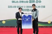 미디어라이프 중부신문 이종인 기자 | 김포시는 17일 솔터실내테니스장에서 대한민국 테니스 스타 정현 선수의 김포시청 직장운동경기부 테니스팀 입단을 기념하고, 데이비스컵 2라운드 진출을 축하하는 행사를 개최했다. 이날 행사에는 김병수 김포시장을 비롯해 임청수 김포시체육회장, 박헌규 김포시테니스협회장과 테니스 관계자 및 동호인 등이 참석해 자리를 빛냈다. 행사는 시민과 동호인을 대상으로 한 팬 사인회를 시작으로 정현 선수의 주요 활약상을 담은 영상 상영, 기념 퍼포먼스, 입단 소감 및 축사 순으로 진행됐다. 특히 이날 행사에서는 정현 선수가 최근 데이비스컵 경기에서 실제 착용한 유니폼을 기념 액자로 제작해 김병수 시장에게 전달하는 의미 있는 시간이 마련됐다. 해당 유니폼은 국가대표 경기 특성상 소속팀 마크를 부착할 수 없음에도 불구하고, 정현 선수가 김포시청 입단을 기념하고 김포시를 알리기 위해 대한테니스협회에 요청해 특별히 김포시청 마크를 부착하고 출전한 것으로 알려져 의미를 더했다. 이어 김병수 시장은 정현 선수에게 꽃다발을 전달하고, 정현 선수의 유니폼에 김포시청 마크를 부착하는 퍼포먼스를 통