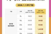 미디어라이프 중부신문 이종인 기자 | 의왕시가 물가 상승 및 경기 침체로 인한 시민들의 경제적 부담을 완화하기 위해 2026년 1월 1일부터 쓰레기 종량제봉투 판매가격을 인하한다. 이번 가격 인하 대상은 일반용 및 재사용 종량제봉투이며, ▲5리터 봉투는 190원에서 150원으로 ▲10리터 봉투는 350원에서 300원으로 ▲20리터 봉투는 680원에서 550원으로 인하된다. 또한, ▲50리터 봉투는 1,700원에서 1,400원으로 ▲75리터 봉투는 2,630원에서 2,100원으로 각각 조정된다. 가격 인하 이전에 구매한 종량제봉투는 그대로 사용 가능하고, 음식물 종량제봉투, 공사장 생활폐기물 포대, 대형폐기물 신고필증은 가격 등은 변동 없다. 김성제 시장은 “종량제봉투는 시민 생활과 밀접한 만큼, 이번 가격 인하가 가계 부담 완화에 도움이 되길 바란다”며, “가격 인하 시점이 2026년 1월 1일이므로, 그전까지 각 가정에서 필요한 양만 구입해 주시길 바란다”고 전했다.