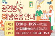 미디어라이프 중부신문 이종인 기자 | 파주시는 반려견을 동반한 야외활동이 잦아지는 가을을 맞아 오는 20일부터 29일까지 생후 3개월 이상의 임신하지 않은 개를 대상으로 광견병 예방접종을 실시한다고 밝혔다. 광견병은 바이러스에 의해 사람과 동물 모두에게 감염될 수 있는 인수공통전염병으로, 잠복기가 상당히 길고 증세가 나타날 경우 치사율이 매우 높기 때문에 사람과 반려동물 모두를 위해 반려견은 매년 1회 반드시 예방접종할 것을 적극 권장하고 있다. 시는 하반기 광견병 예방사업을 위해 예방백신 4,500마리 분을 무상 지원하며, 예방접종을 희망하는 반려견 보호자는 33개 지정 동물병원을 방문해 시술비 1만 원만 부담하면 접종이 가능하다. 참여 동물병원 목록은 파주시청 누리집 공고문을 통해 확인할 수 있다. 동물병원이 없는 읍면지역은 시에서 직접 수의사를 파견해 순회접종을 진행하며, 이 경우 접종비 전액을 시에서 지원할 방침이다. 읍면지역 순회접종 일정은 해당 읍면 행정복지센터 산업팀에 문의하면 된다. 아울러 파주시는 야생동물의 광견병 전파를 막기 위해 광견병 미끼백신을 너구리 등 야생동물이 자주 출