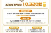 미디어라이프 중부신문 이도경 기자 | 17년 만에 노사 합의로 결정! 2026년 시간당 최저임금 10,320원 ■ 최저임금이란? 노동자의 생활 안정을 보장하고 더 나은 일자리 환경을 만들기 위해 임금의 최저수준을 보장하는 제도 ■ 월 환산액 2,156,880원(주 40시간 기준, 유급 주휴* 8시간 포함) *주휴수당: 근로자(1주 소정근로시간 15시간 이상)가 1주일 개근한 경우, 주 1회 유급휴일에 대해 지급되는 수당 ■ 포함되는 금액 - 매월 1회 이상 정기 지급하는 임금(매월 지급 상여금, 식비, 숙박비, 교통비 등) ■ 제외되는 금액 - 통화 이외의 것으로 지급하는 임금 - 소정근로 외의 임금(시간외수당 등)