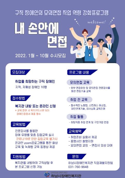 미디어라이프 중부신문 엄병철 기자 | 하남시장애인복지관은 경기도장애인시설연합회에서 주최하고 하남시장애인복지관에서 주관하는 구직장애인의 성공 유지를 위한 모의면접 및 역량강화 프로그램 ‘내손 안에 면접’ 참여자를 모집한다.