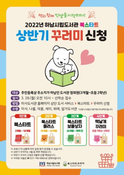 영유아의 평생 독서습관 형성을 위한 북스타트 책 꾸러미는 ▲1단계 북스타트(3~18개월) ▲2단계 플러스(19~35개월) ▲3단계 보물상자(36개월~취학 전) ▲4단계 책날개(초등1~2학년)로, 각 단계마다 그림책 2권과 에코백, 가이드북 등으로 구성돼 있다. 북스타트 신청자에게 개별 공지 후 4월 중 배부할 예정이다.