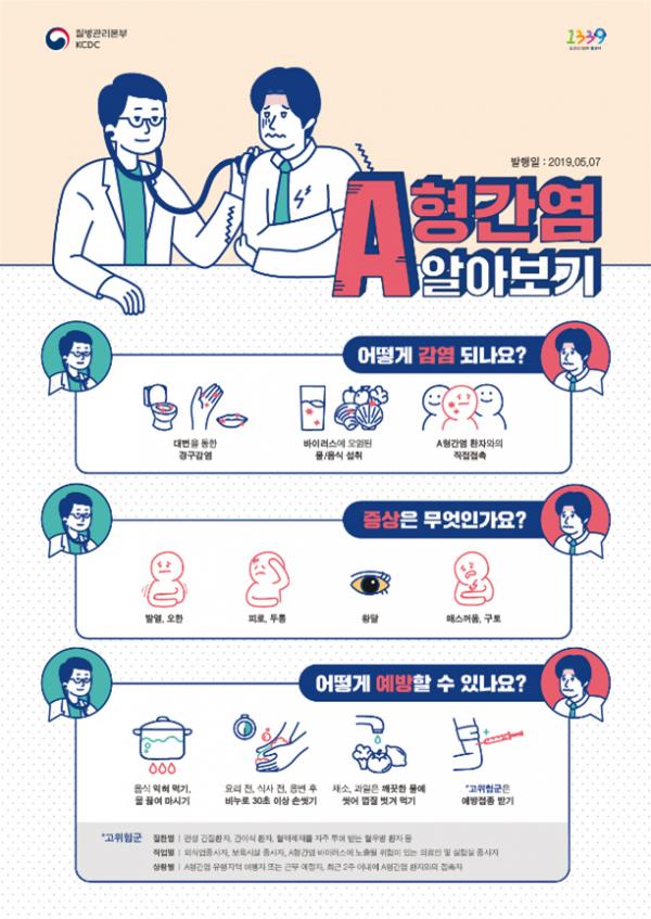 특히 올해는 A형간염 환자가 크게 증가하고 있어 예방을 위해서 조개류 등 음식물을 익혀먹고, 안전한 물 섭취, 그리고 손씻기 등 개인위생수칙을 준수해야 하고 가족 중 A형 간염 환자가 발생한 경우 같이 생활하는 가족은 반드시 노출 후 2주 이내로 A형간염 항체검사 및 예방접종을 받아야 한다.