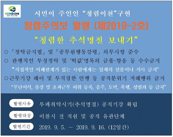 이천시청은 청렴이천 구현을 위해 청렴한 추석명절 보내기에 전 직원이 동참해 줄 것을 당부하는 한편 시홈페이지, 옥외전광판, 내부 홍보모니터 등을 통해 지역사회에도 청렴문화가 널리 확산되도록 홍보했다.