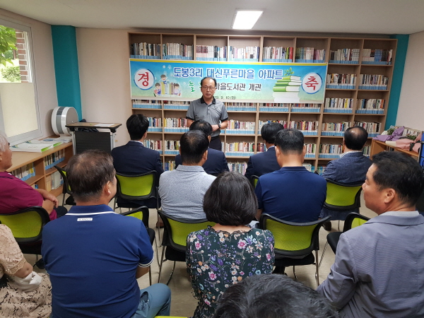 이영식 도봉3리 마을이장은 “도서관 조성에 도움을 주신 많은 분들께 감사드리며 늘푸른 마을도서관이 지역주민들의 문화 사랑방 역할을 톡톡히 하여 주민들의 꿈과 희망을 키워나가는 작지만 커다란 독서 문화 공간이 될 것으로 기대한다.”라고 말했다.