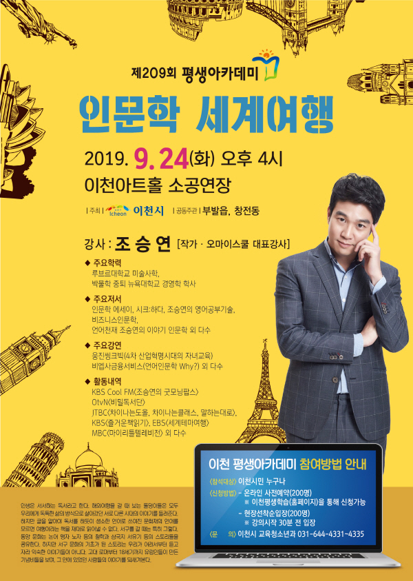 이번 제209회 평생아카데미는 2019년 마지막 아카데미 강연으로, 조승연 작가는 ‘인문학 세계여행’이라는 주제로 고대 로마부터 18세기까지 유럽인들의 생각과 삶의 방식을 전하고, 곳곳에 숨어있는 이야기를 통해 이천 시민들과 인문학적 사고의 중요성을 공유하는 유익한 시간을 가질 예정이다.