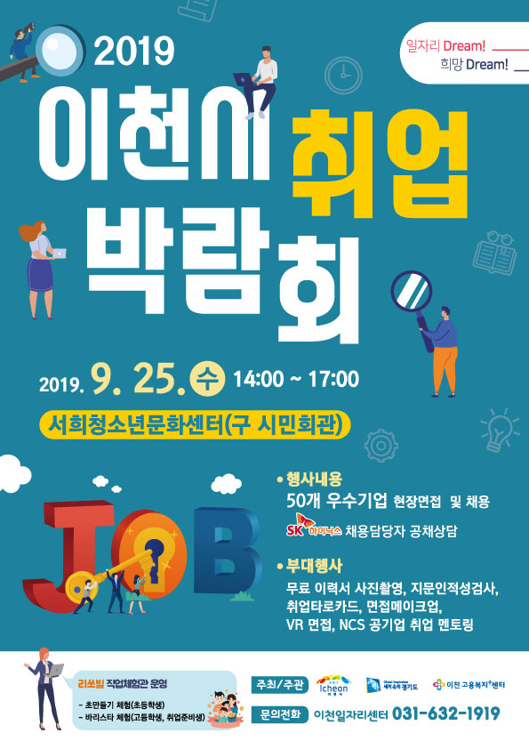금번 취업박람회는 이천시와 경기도가 주최하고 이천고용복지플러스센터가 공동주관하며, 이천시가 연중 가장 대규모로 개최하는 취업박람회로써 지역의 우수한 50개 기업이 참여한 가운데 사무·관리·서비스·물류·생산직 등의 다양한 분야에서 350명을 채용할 예정이다.