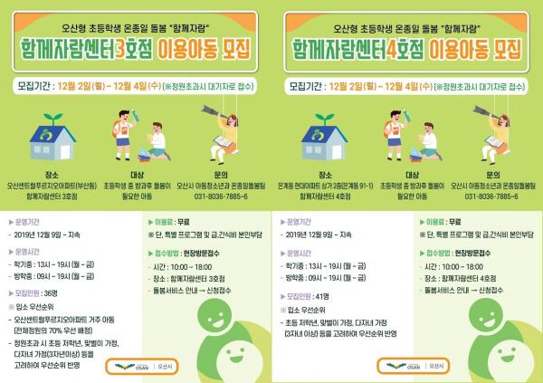 오산시는 이에 따라 이들 시설을 이용할 아동을 12월 2일부터 4일까지 모집한다. 오산시에 거주하는 초등학생 중 돌봄이 필요한 아동은 소득에 상관없이 누구나 신청이 가능하며 정원 초과 시 저학년, 맞벌이가정, 다자녀가정의 아동 등 돌봄 우선순위를 적용해 선정된다.