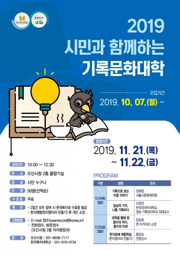 지역사회 협력사업으로 한국복지대학교와 공동으로 진행하는 이번 행사는 시민들에게 인문학적 소양을 높일 수 있는 기회를 제공하고자 기록문화 프로그램으로 기획됐다.