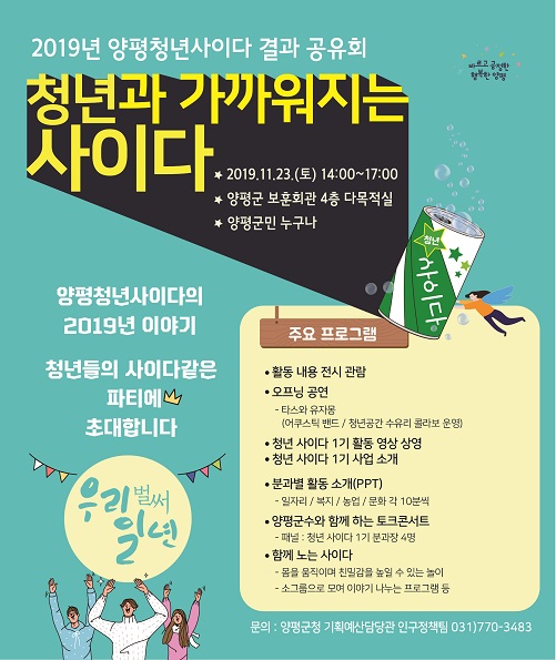 이날 행사에서는 오프닝 공연을 시작으로 청년사이다 1기 사업 소개, 분과별 활동 발표, 양평군수와 함께 하는 토크콘서트, 전시 프로그램 관람, 함께 노는 사이다, 제2기 청년사이다 홍보 등 다양한 프로그램이 준비되어 있다.