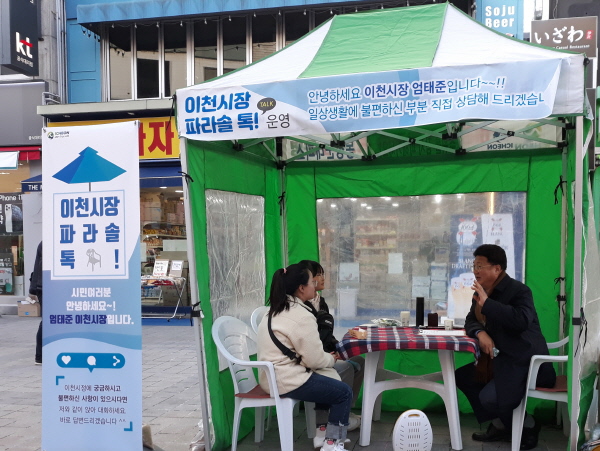 ‘이천시장 파라솔 톡~’은 생업에 바쁜 자영업자나 주부, 직장인, 학생 등의 고충을 직접 듣는 소통채널로 행정의 사각지대를 해소하고 일반시민들의 생생한 현장목소리를 청취 할 수 있어 시민들에게서 큰 호응과 관심을 받고 있다.