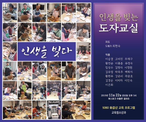 이번 전시회에서는 이천시 교육청소년과 5060 신중년 교육프로그램 중 ‘인생을 빚는 도자교실’ 상·하반기 수강생들이 만든 창작 작품과 수강생들을 지도한 최현숙 도예가의 작품들을 볼 수 있다.