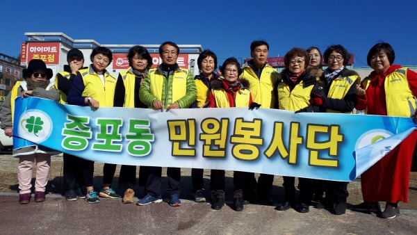 증포동 민원봉사단은 지난 5월 29일 발대식을 가졌으며 현재 18명의 회원이 고객만족 서비스를 위해 증포동 행정복지센터 민원실에서 민원안내 봉사를 하고 있다.