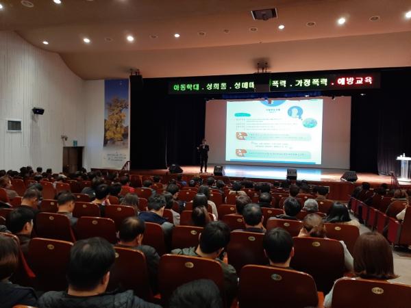 성남아동보호전문기관 서태원 관장의 아동학대 예방교육은 아동학대 정의와 아동학대 의심 사항에 관해 신고자로서의 공무원의 역할을 강조했으며 성희롱·성매매·성폭력·가정폭력 교육에서는 한국양성평등교육진흥원 폭력예방통합 전문강사인 정은영 강사가 “세상은 바뀌었다, 나는”이라는 주제로 현재 사회적 이슈가 된 Me Too 사건과 관련 사례로 알아보는 성희롱, 데이트 폭력 및 가정폭력, 성매매 실태 등 성인지 감수성 향상을 위한 내용을 바탕으로 4대 폭력 예방교육을 진행했다.