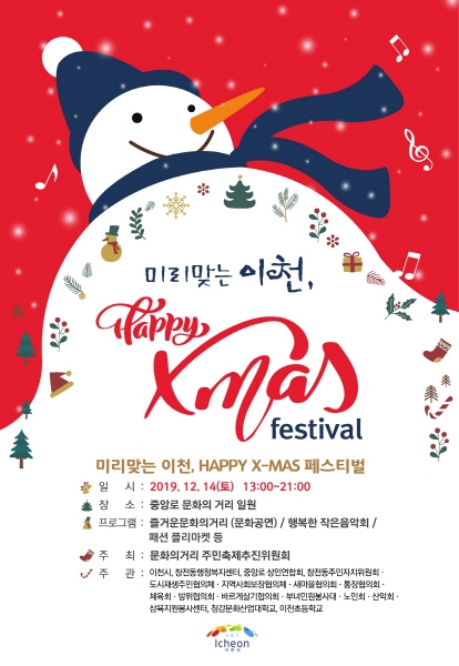 문화의 거리 주민 축제추진위원회가 주최하고 주민협의체 및 유관단체가 주관하는 ‘미리 맞는 이천, HAPPY X-Mas 페스티벌’는 오후1시부터 오후 9시까지 중앙로 문화의 거리 내에서 열린다.