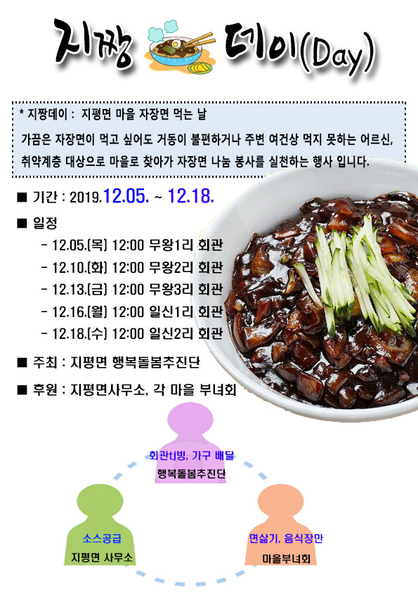 지짱데이는 별다른 외식공간이 없고 배달도 여의치 않은 마을로 직접 찾아가 자장면을 제공하는 지평면 마을 자장면 먹는 날이다.
