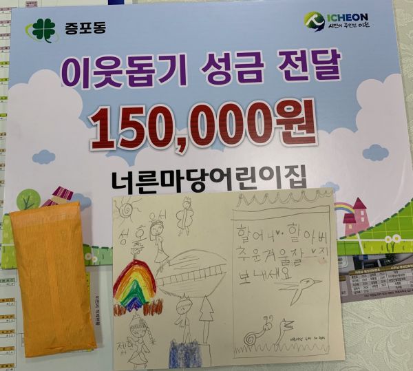 이번 성금은 너른마당 어린이집에서 실시한 시장놀이 프로그램의 수익금 전액으로 증포동 관내 거주하는 저소득 가정에 지원될 예정이다.