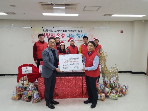 이번 행사는 산타로 변장한 kt텔레캅 강남본부 남부지사 임직원들이 관내 저소득층 아동 30가구에 학용품, 놀이용품, 과자세트 등을 전달해 사랑과 온정을 나눴다.