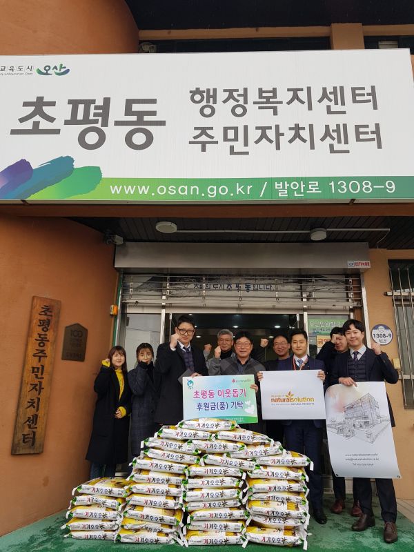 정하철 초평동장은 어려운 이웃들을 위해 쌀을 기탁한 내추럴솔루션 관계자에 깊은 감사의 뜻을 전하면서 “후원물품은 지역 소외계층에 소중히 전달하하겠다”고 말했다.