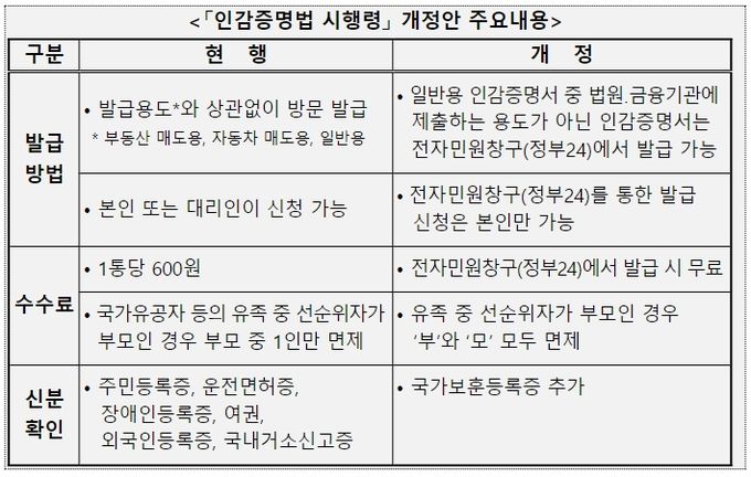 한편, 이와는 별도로 인감증명서 발급 신청 시 본인확인을 위한 신분증으로 국가보훈등록증이 추가되며, 발급 수수료 면제 대상도 확대된다.