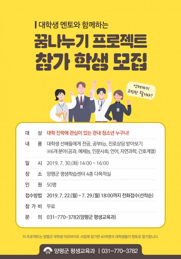 ‘꿈나누기 프로젝트’는 양평군 대학생 아르바이트 사업의 일환으로 올해 처음 시행하는 것으로 아르바이트 참가 대학생이 ‘멘토’, 청소년들이 ‘멘티’가 되어 진행하는 멘토링 프로그램이다.
