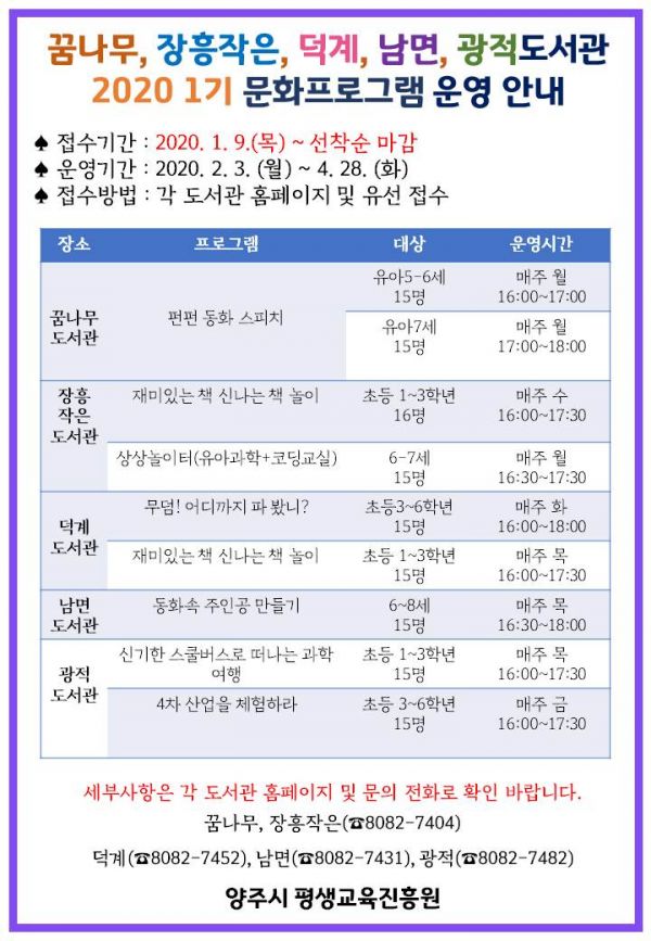 도서관별로 살펴보면 꿈나무도서관은 5~7세 대상 ‘펀펀 동화 스피치’를 , 장흥작은도서관은 초등 1~3학년 대상 ‘재미있는 책 신나는 책 놀이’, 6~7세 대상 ‘상상놀이터을 진행한다.
