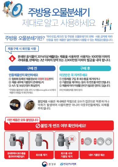 주방용 오물분쇄기는 하수처리시설이 있는 일반 가정에서 음식물 찌꺼기를 분쇄해 오수와 함께 하수관로로 배출되도록 한 장치로 인증표시가 없는 제품, 회수통 및 거름망이 없는 제품, 음식물 찌꺼기가 20% 이상 배출되는 제품 사용은 모두 불법이다.