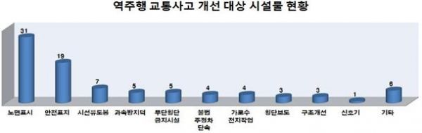 2015년 역주행 교통사고 빈발지점 시설 개선사업 이후 교통사고가 발생하지 않아 예방 효과가 큰 것으로 나타났고 금년 실태조사에서는 旣 개선 지점을 제외함 88개 개선대상 시설물을 유형별로 보면, 노면표시 31개와 안전표지 19개가 가장 많았고 이어 시선유도봉 7개, 과속방지턱·무단횡단금지시설 각 5개, 불법주정차 단속·가로수 전지작업 각 4개, 횡단보도·구조개선 각 3개 등이었다.