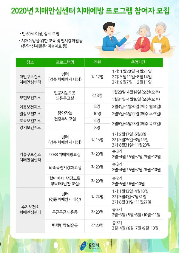 기흥구·수지구보건소도 각각 뇌똑똑인지강화교실과 두근두근·반짝반짝 뇌운동 프로그램을 3기에 걸쳐 운영하는데 1기 수업이 2월과 3월에 문을 연다.