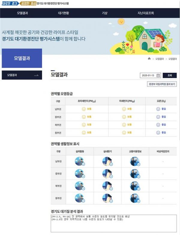 이 중 도민을 대상으로 한 대기환경 정보제공 시스템의 정보는 도내 대기질 모델링 결과, 시군 및 시도별 대기질 현황, 기상정보 등을 바탕으로 대기질에 따른 권역별 생활정보 등으로 구성되어 있으며 대기환경 정보서비스 홈페이지와 대기모델링 정보서비스 홈페이지를 통해 1월 16일부터 확인할 수 있다.