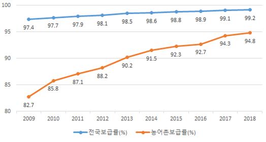 농어촌지역 보급률은 94.8%로 전년 대비 0.5%p 상승했으며 전국 보급률과 함께 지속적으로 증가하고 있다.
