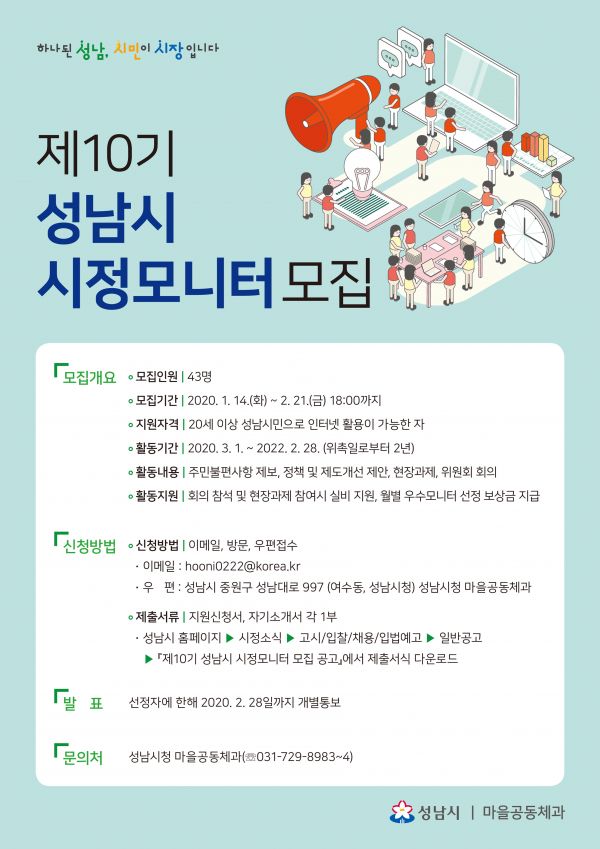 시정모니터 활동을 하려는 만 20세 이상 성남시민은 기한 내 신청서와 자기소개서를 시청 6층 마을공동체과에 직접 내거나 우편, 담당자 이메일 등으로 보내면 된다.