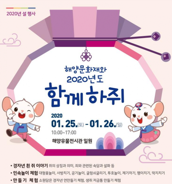 국립해양문화재연구소는 오는 25일부터 26일까지 해양유물전시관 야외광장과 라운지에서 경자년 흰쥐 이야기, 민속놀이 체험, 만들기 체험 등 3가지 주제로 ‘해양문화재와 2020년도 함께 하쥐’ 행사를 펼친다.