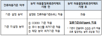 정부는 농약 허용물질목록관리제도로 인해 국민의 먹거리 안전성이 높아질 것으로 기대하며 농약 허용물질목록관리제도가 앞으로도 안정적으로 정착할 수 있도록 관계자들의 지속적인 협조와 노력을 당부한다고 밝혔다.