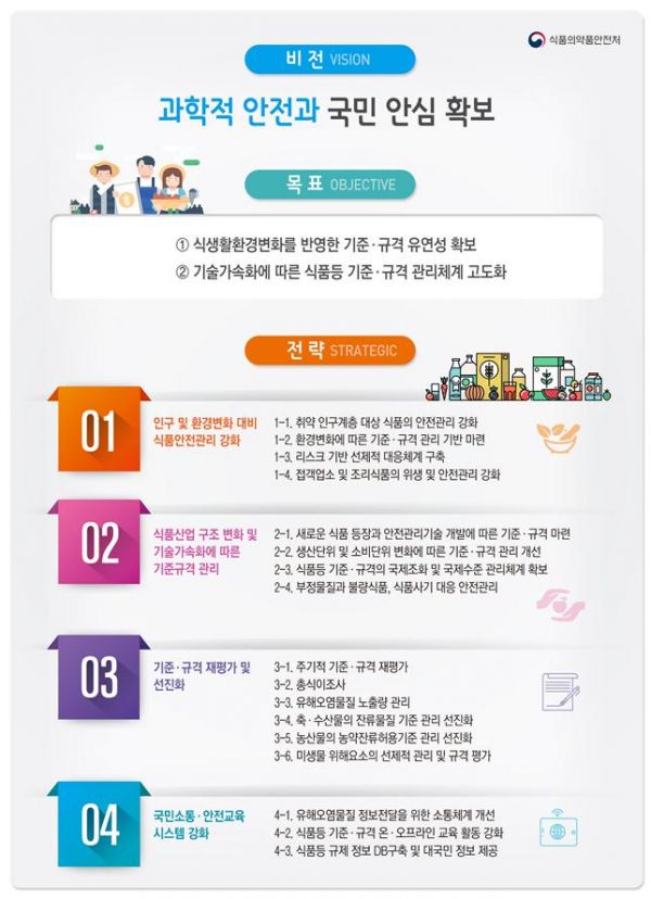 주요 추진 내용은 인구 및 환경변화 대비 식품안전관리 강화 식품산업 구조 변화 및 기술가속화에 따른 기준·규격 관리 기준·규격 재평가 및 선진화 등이다.