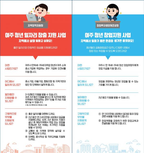 여주 청년 일자리 창출 지원 사업은 행정안전부가 주도하는 지역주도형 청년일자리사업의 일환으로 중소기업 등이 청년을 신규 고용할 경우 2년간 청년 인건비의 80%를 기업에 지원해주고 참여청년에게는 직무교육·워크숍·교통비 등을 제공하는 사업이다.