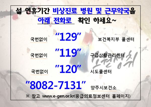 응급환자에 대한 상담과 진료안내는 양주시 보건소 진료대책상황실과 보건복지콜센터, 119구급상황관리센터, 시도콜센터를 이용하면 자세히 안내받을 수 있다.