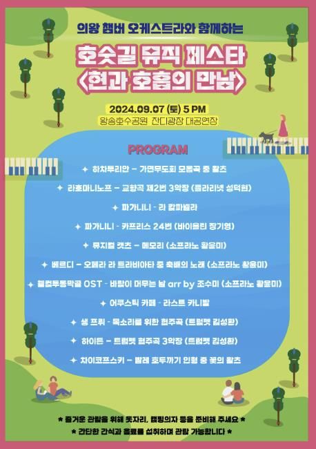 이번 2024 호숫길 뮤직 페스타는 그 두 번째 시리즈로, 실력 있는 솔리스트들과의 협연으로 작년보다 더욱 풍성해진 프로그램을 준비했다.