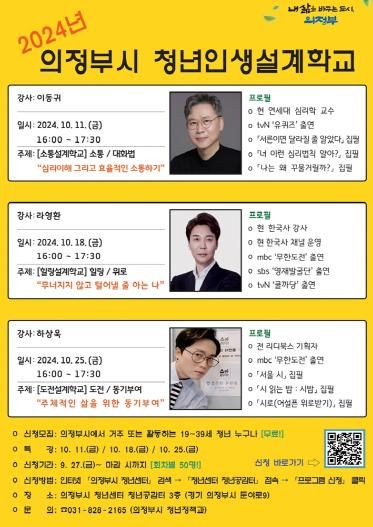 참여 신청은 9월 27일부터 의정부시 청년센터(청년공감터) 누리집의 프로그램 신청란 또는 홍보물 하단 정보무늬(QR코드)에서 가능하며, 회차별 50명을 선착순으로 접수한다.