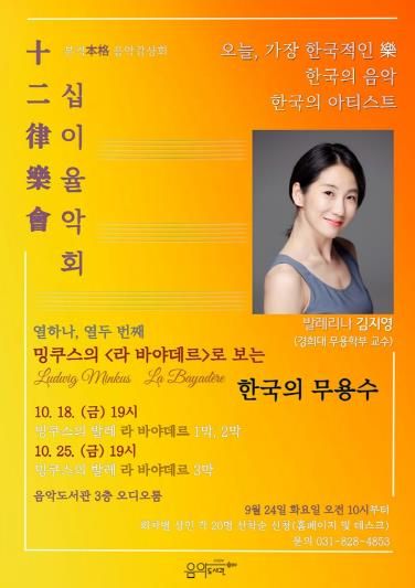 십이율악회는 전문가의 해설이 함께하는 본격 음악감상 프로그램이다. 올가을 우리나라를 대표하는 발레단인 국립발레단과 유니버설발레단이 한 달 간격으로 무대에 올라 화제를 모으고 있는 발레 ‘라 바야데르’ 영상 감상회를 진행한다.