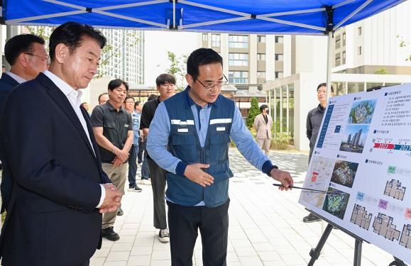 지난 25일 더샵 리듬시티를 방문한 김동근 시장은 현장을 둘러본 후 입주 예정자들의 불편사항 및 생활편익시설 개선에 대한 의견에 귀를 기울였다.