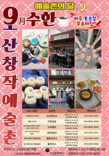 2024 오산창작예술촌 ‘예술촌의 달’은 10월 26일에 싸전마당 체험페스티벌로 운영한다. 싸전마당 체험페스티벌에서는 예술촌 6개 공방체험 프로그램 외에 가족단위 참여자의 기호를 고려하여 선정한 10여개의 다양한 체험프로그램을 축제의 형식으로 운영할 예정이다.