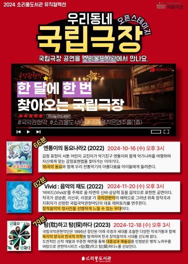 2024년 '우리동네 국립극장'은 전국 방방곡곡 누구나 쉽게 국립극장 우수 공연 콘텐츠를 접할 기회를 제공하고자 기획된 국립극장 공연영상화 사업이다.