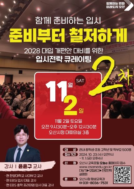 설명회는 다음달 2일 오산시청 대회의실에서 개최되며 EBS입시 대표강사인 윤윤구 강사가 학생과 학부모가 이해하기 쉽게 ▲입시 트렌드 ▲2028 대입제도 개편안 주요사항 ▲비교과 준비 등 입시의 모든 것을 강의한다.