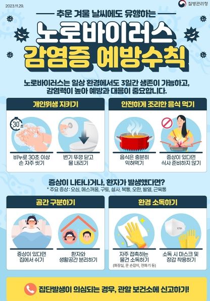 노로바이러스는 기온이 낮은 겨울철에 바이러스의 생존 기간이 연장되고 감염력이 높아지고 영하 20℃에서도 잘 살아남을 수 있어서 여름철보다 겨울철에 더 많이 발생하는 식중독 바이러스로 급성 위장염을 일으킨다.