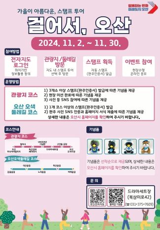 오산의 자연, 문화, 역사적 명소와 오산오색둘레길을 탐방하며 오산시의 매력을 발견할 기회를 제공하는 ‘걸어서, 오산’ 스탬프 투어는 누구나 참여가 가능하다.