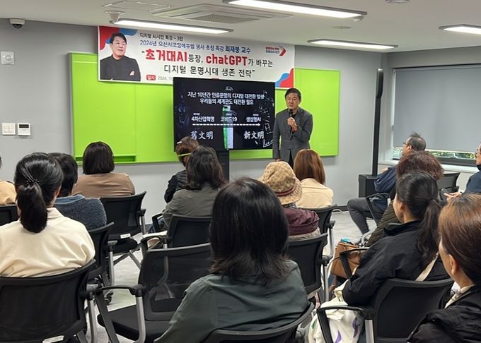 미디어라이프 중부신문 이종인 기자 | 오산시는 1일 오산AI코딩에듀랩에서 ‘초거대 AI 등장, chatGPT가 바꾸는 디지털 문명시대 생존 전략’을 주제로 명사 초청 디지털 AI시민 특강을 진행했다.